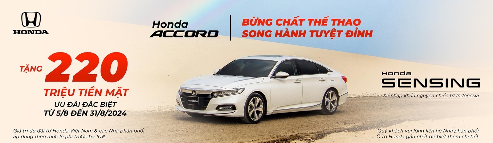 - Honda Accord: Giảm Tiền Mặt + Gói phụ kiện: Thảm lót sàn, Vá lốp khẩn cấp, Film cách nhiệt Solux, Gói phủ gốm Ceramic + 2 năm bảo dưỡng, Gói bảo hành điều hòa 1 năm.