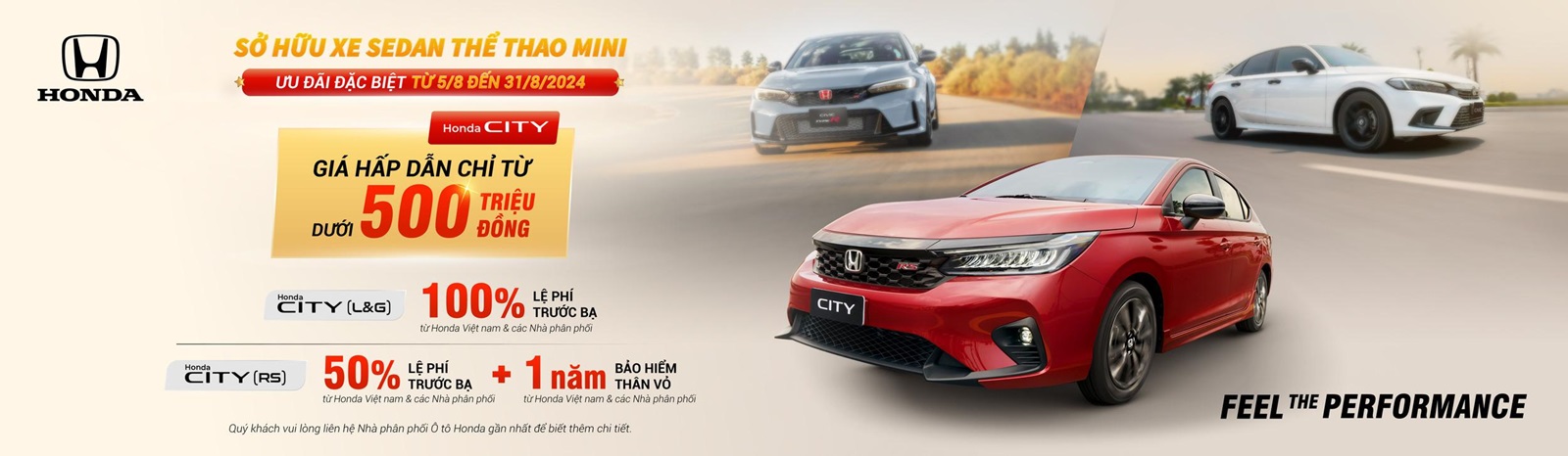 - Honda City: Giảm Tiền Mặt 50 triệu + Gói phụ kiện: Thảm lót sàn, Vá lốp khẩn cấp, Film cách nhiệt Solux, Gói phủ gốm Ceramic + 2 năm bảo dưỡng, Gói bảo hành điều hòa 1 năm
