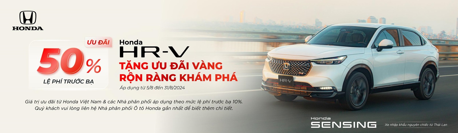 - Honda HR-V: Giảm Tiền Mặt + Gói phụ kiện: Thảm lót sàn, Vá lốp khẩn cấp, Film cách nhiệt Solux, Gói phủ gốm Ceramic + 2 năm bảo dưỡng, Gói bảo hành điều hòa 1 năm