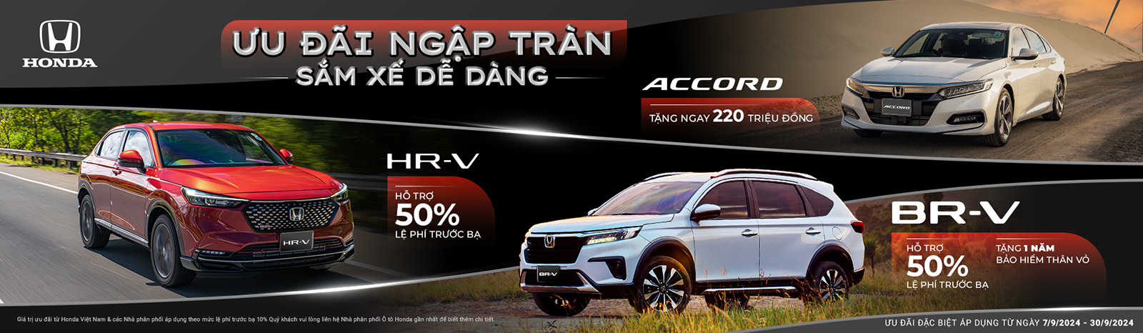 - Honda CR-V: Giảm Tiền Mặt 100 triệu + Gói phụ kiện: Thảm lót sàn, Vá lốp khẩn cấp, Film cách nhiệt Solux, Gói phủ gốm Ceramic + 2 năm bảo dưỡng, Gói bảo hành điều hòa 1 năm